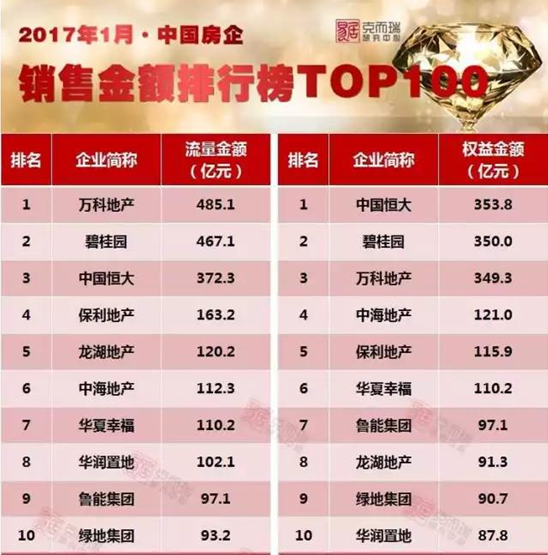 2017年1月中国房前销售金额排行榜前十(来源:克而瑞研究中心)
