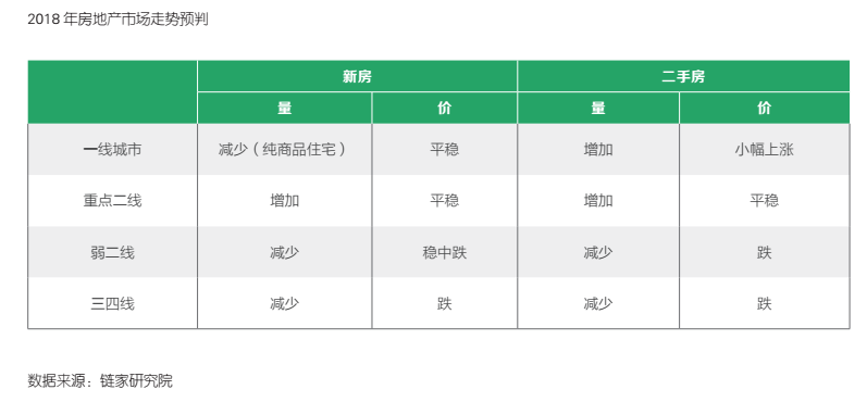人民网北京12月27日电 (孔海丽)日前,链家研究院发布了《2018年房地产市场展望》研究报告。报告认为,2017年是房地产市场超级繁荣期的尾巴,预计2018年成交量将会下降,新房投资增速进一步下滑。就城市而言,预计一线城市二手房市场量价平稳,三、四线城市房地产市场将迎来量价的降温。