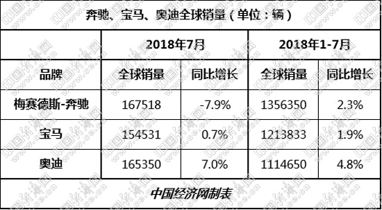 在全球市场,尽管因供应商起火等外力因素,奔驰7月销量出现7.9%的下滑,但从累计销量来看,奔驰依旧大幅领先宝马、奥迪,继续占据全球高档车市销量冠军。宝马、奥迪则依然分列二、三位。