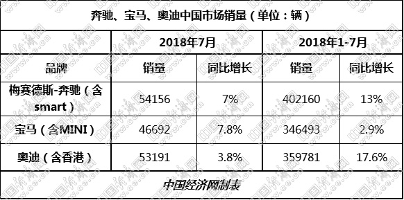 就数据而言,ABB三家无论是7月当月还是前7月,均保持着正向增长。其中,奔驰、宝马给出的定义是“稳健”、“平稳”增长,奥迪则是收获了“在华最好7月”。在竞争格局上,三家品牌也并未有大的变化,依旧维持着年初以来的座次:奔驰继续保持领先,奥迪加速追赶,宝马则是按照既定目标一路向前。