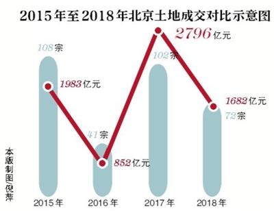 但是,进入2018年,北京土地市场出现了较为明显的降温。2018年,北京共成交土地72宗,成交额1682.9亿元。成交宗数及成交额同比均大幅下跌。2018年土地成交宗数同比2017年下跌29%,仅高于2016年成交水平,处于历史低位,土地出让金同比2017年下跌40%。