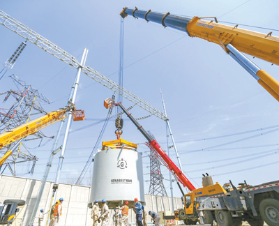 3月19日,江苏梅里至惠泉500千伏线路加装串联电抗器工程施工现场。人民视觉