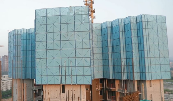 而在外墙施工上,则采用了先进的自升式外爬架技术,爬架采用全封闭维护结构,让工人施工更加安全,也不用再另外搭建脚手架,减少建筑垃圾产生。