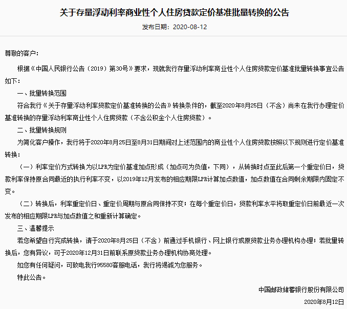 公告同时表示,批量转换完成后,若对转换结果有异议,可于2020年12月31日(含)前通过手机银行自助转回或与贷款经办行协商处理。