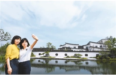 杭州临平净水厂“水美公园”采用“地下污水处理,地上绿地公园”模式建造,约7米深的地下是一片全封闭净水厂,日处理20万吨污水,在地面增加了约200亩的绿化面积。图为市民在“水美公园”拍照留念。 龙 巍摄(人民图片)