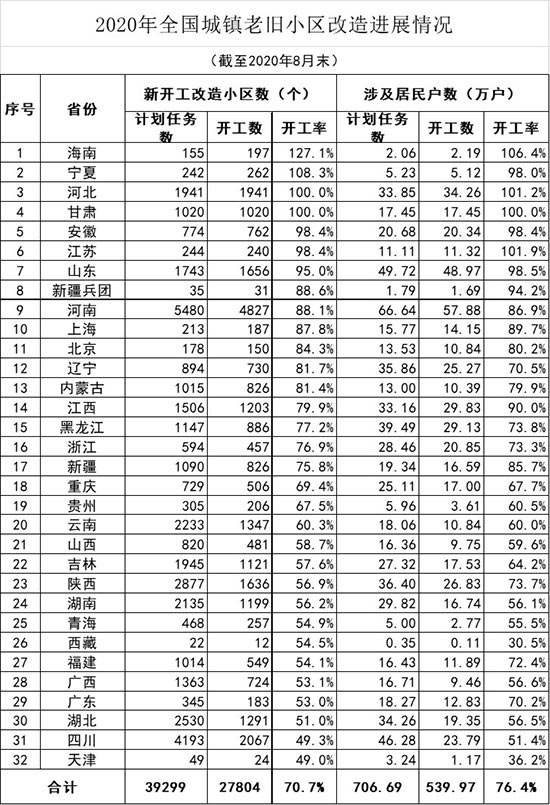 人民网北京9月28日电(记者孙红丽) 据住房和城乡建设部消息,根据各地上报情况汇总统计,2020年1—8月份,全国新开工改造城镇老旧小区2.78万个,占年度目标任务(约3.9万个)的70.7%,较7月末提高了14.3个百分点;涉及居民539.97万户,占年度目标任务(约700万户)的76.4%,较7月末提高了13.8个百分点。