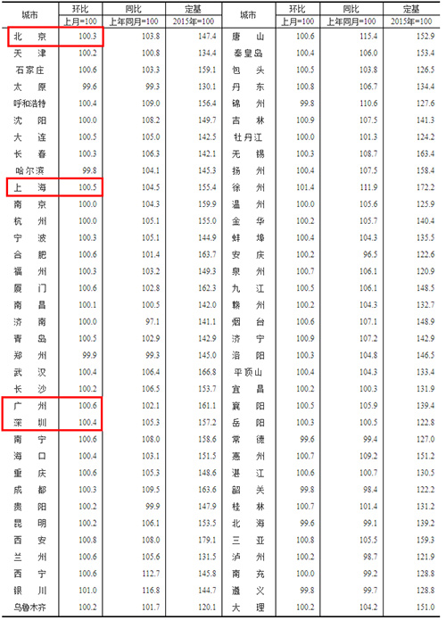人民网北京10月20日电(记者孙红丽)10月20日,国家统计局发布9月份商品住宅销售价格变动情况统计数据。经初步测算,4个一线城市新建商品住宅销售价格环比上涨0.4%,涨幅比上月回落0.2个百分点。其中,北京、上海、广州和深圳分别上涨0.3%、0.5%、0.6%和0.4%。