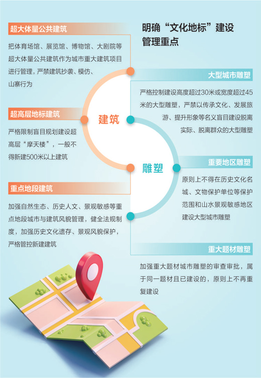 住房和城乡建设部日前印发的《关于加强大型城市雕塑建设管理的通知》中明确了建设管理重点,要求加强历史文化保护和自然景观环境等重要地区以及城市重要轴线、景观节点上的雕塑建设管理。华汇集团规划咨询研究院院长陈扬表示,各地应加强自然生态、景观敏感等重点地段的城市风貌管理。比如,在风景名胜区内,建设项目应当符合风景名胜区规划,并与景观相协调,不得破坏景观、污染环境、妨碍游览。在核心景区内,不建设与风景名胜资源保护无关的其他建筑物,已经建设的,也应当按照风景名胜区规划,逐步迁出。