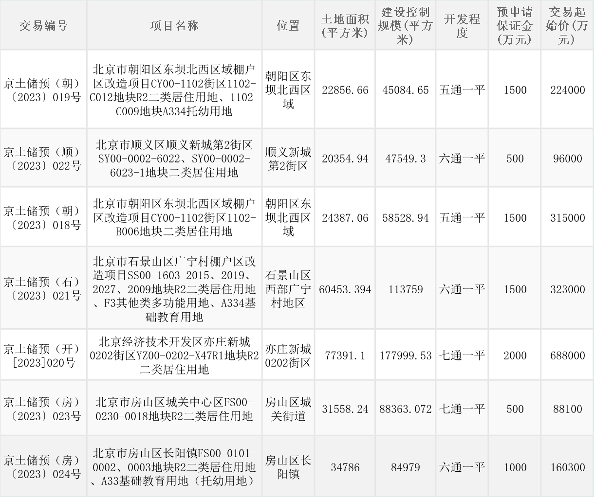 央广网北京5月8日消息 5月6日晚间,北京市规划和自然委员会挂牌7宗预申请住宅用地。其中,朝阳区、房山区各两宗,经开区、顺义区、石景山区各一宗,总土地面积约27.18万平方米,总建设控制规模约61.63万平方米,总起始价189.44亿元。