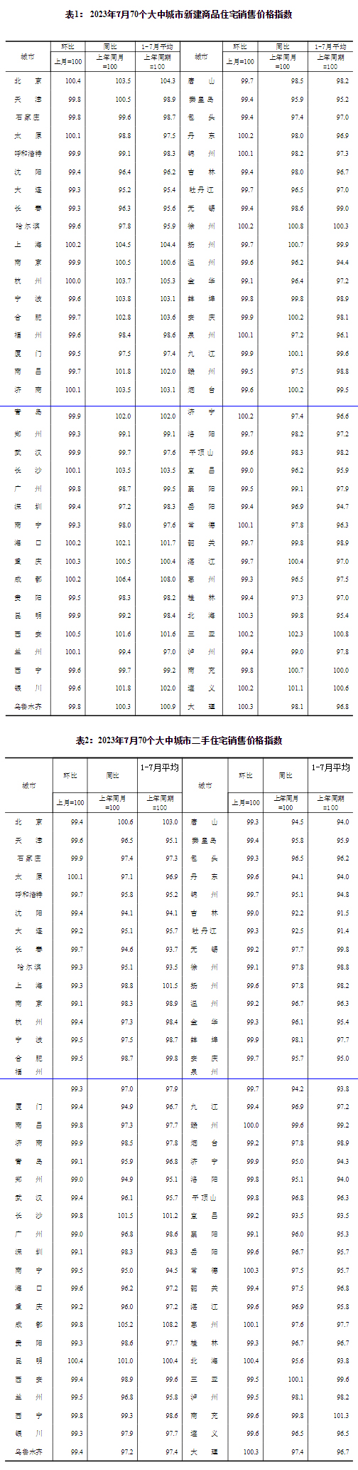 从新建商品住宅看,7月份,一线城市新建商品住宅销售价格环比连续两月持平,其中北京和上海环比分别上涨0.4%和0.2%,广州和深圳环比分别下降0.2%和0.6%;二线城市新建商品住宅销售价格环比由上月持平转为下降0.2%;三线城市新建商品住宅销售价格环比下降0.3%,降幅比上月扩大0.2个百分点。从二手住宅看,7月份,一线城市二手住宅销售价格环比下降0.8%,降幅比上月扩大0.1个百分点;二线城市二手住宅销售价格环比下降0.5%,降幅比上月扩大0.1个百分点;三线城市二手住宅销售价格环比下降0.4%,降幅与上月相同。