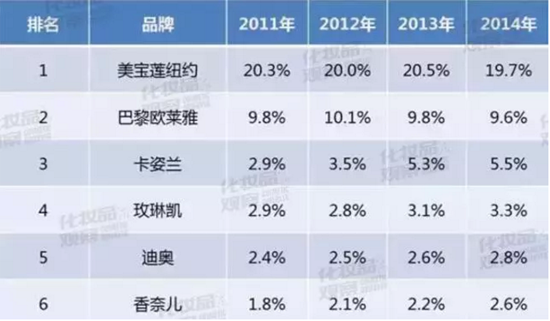 2014年,美宝莲在中国的零售额到达了40亿人民币,而且以远超其他品牌的市场占有率稳居中国彩妆市场第一位的位置。但随着国内本土彩妆的兴起及现有彩妆市场的饱和,美宝莲在经历野蛮生长期后增长速度开始放缓。