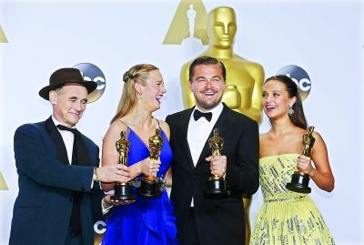 左起:第88届奥斯卡最佳男配马克·里朗斯、最佳女主布丽·拉森、最佳男主莱昂纳多·迪卡普里奥和最佳女配艾丽西亚·维坎德