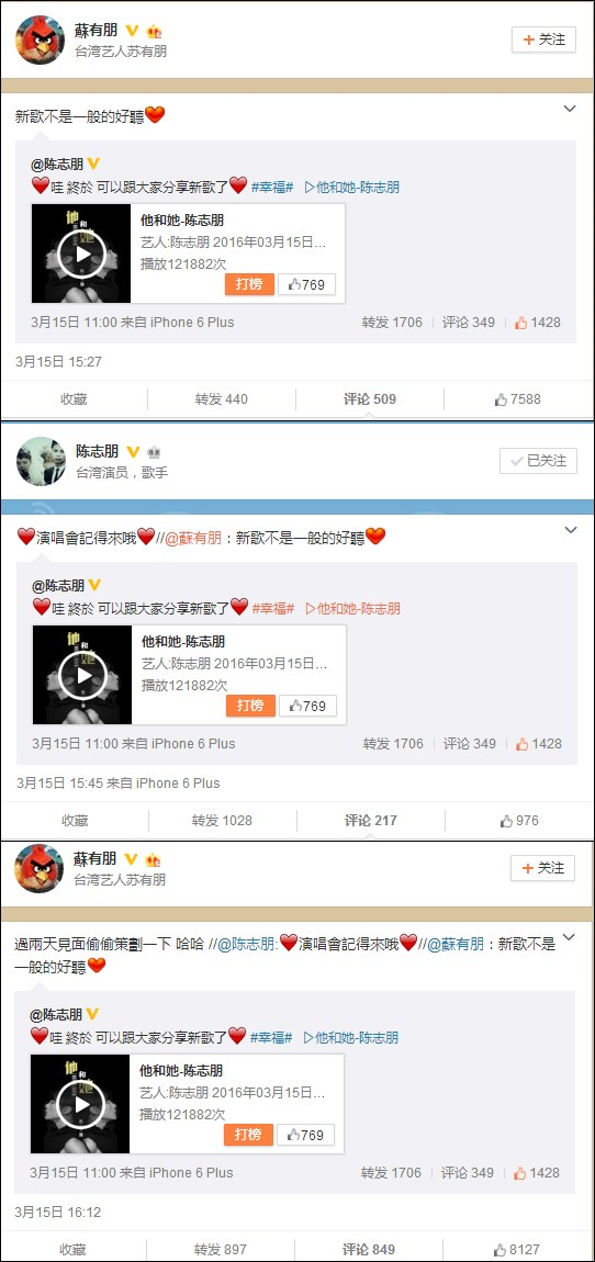 3月15日下午,台湾歌手陈志朋在微博宣传自己的新歌《他和她》,之前曾和陈志朋传过不合的小虎队另外一个成员苏有朋第一时间转发了该微博,并大赞“新歌不是一般的好听”,几分钟后,陈志朋回复“演唱会记得来哦”,正当大家以为互动就这么结束的时候,苏有朋“过两天见面偷偷策划一下 哈哈”。