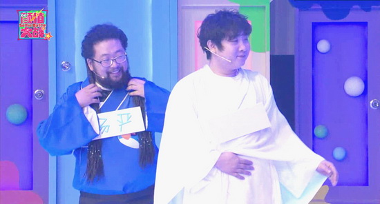 一开场两人被发糖——“选妃”可抱美人归。遮挡住脸庞的各位“妃子”穿着古风裙,俏丽非凡的样子让两位嘉宾欣喜不已,想着总算可以和漂亮的姑娘们搭档了,谁料半路杀出王守英,头戴瓜子身披绿纱,一身自制衣服就劫走了乔杉,看着这二人配对成功,修睿还做着自己会和小美女搭档的美梦,然而张大大直接判决,修睿配对小甜甜。