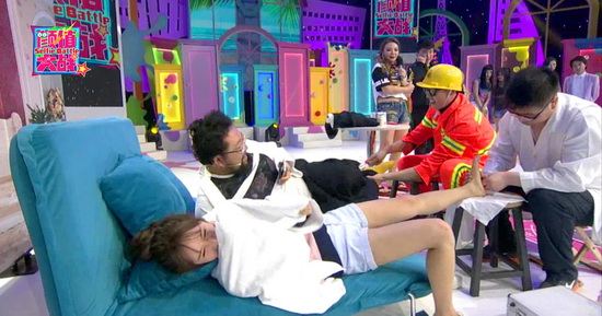 更悲惨的还在后面等着修睿。原地做造型自拍都困难无比,身子完全掌握不到平衡,直接踹翻道具椅,飓风碉堡更是变成一座阻挡他前进的大山,一步两步往前跳,努力自拍摆造型,无奈实在抵挡不住劲风,直接单膝跪地整个人扑倒。和美女体验情景自拍,抽到“扑倒与被扑倒”,被搭档嫌弃还要忍受挠脚心的煎熬,拍出惊悚照被张大大、小甜甜一阵暴风吐槽。而乔杉则和一贯的老搭档小甜甜再度演绎情景,两人同吃小香肠自拍,一边乔杉被挠脚心哭笑不得,气得抢下按摩器直敲“按摩师”。
