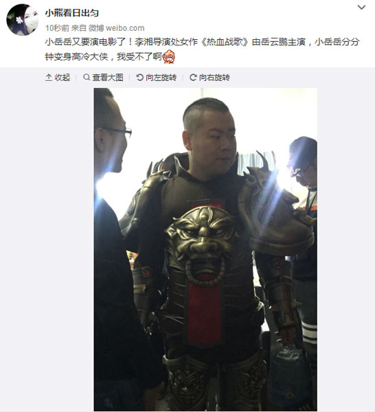 近日,网上流传着一组岳云鹏身穿铠甲手持宽重兵器的拍摄花絮照,照片中他一套夸张的武侠造型,霸气外漏,一改以往“贱萌”的形象,引起网友们的围观。 据知情人士透露,照片中的岳云鹏正在为李湘的导演处女作《热血战歌》试装。