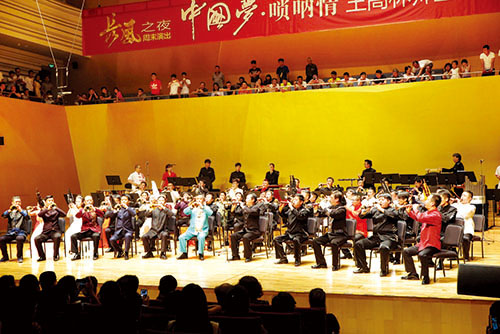 本报讯 唢呐悦耳、笙箫婉转,一曲吹打乐《大得胜》直击观众心扉;60多名演奏成员配合默契、技艺高超,赢得观众阵阵掌声。6月17日晚,由山西省文化厅、山西大剧院主办,山西演艺集团歌舞剧院民族乐团演出的“长风之夜”文化惠民活动——“《中国梦·唢呐情》王高林师生唢呐音乐会”在山西大剧院音乐厅精彩奏响。