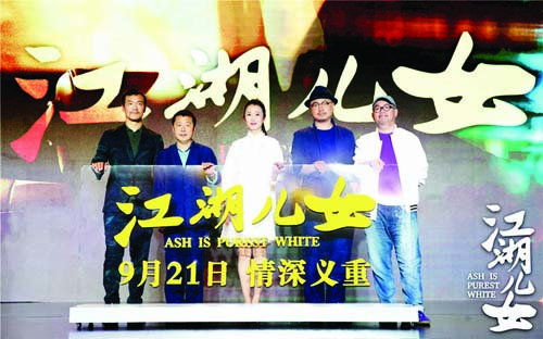 《江湖儿女》由上影集团、北京西河星汇、欢喜传媒、法国MK2、北京润锦投资、无限自在传媒及歌童映画联合出品,片方在当天发布会上公布了定档预告片和两款定档海报,伴随着紧凑的节奏,“咱们是哪种人?”“江湖上的人。”两句掷地有声的台词将人拉入这场江湖风暴,金钱、暴力、儿女情长随之展开;海报则一款整体色调偏暗,风雨欲来,另一款则色调明亮,情深意切,虽然色调、构图和氛围各不相同,但巧巧与斌哥爱情故事中的狂风暴雨与江湖气盛儿女情长同样呼之欲出,动人心魄。