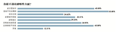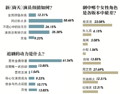 此外,调查表明,有53.85%的观众认为“选角不符合期待”是对新《倚天》最不满的地方,有43.08%的观众则认为“慢动作的武打戏份”和“主演演技不在线”是他们对新《倚天》的不满之处。观众王先生表示,“版本太多审美疲劳,服装太鲜艳、现代”是让他弃剧的原因。