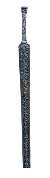 原著描写:灭绝师太取出一柄四尺来长的古剑来……但见剑鞘上隐隐发出一层青气,剑未出鞘,已可想见其不凡,只见剑鞘上金丝镶着的两个字:“倚天”。