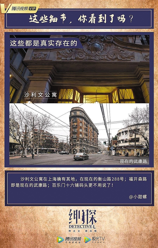 《绅探》的故事背景设在民国时期的上海,沙利文公寓、百乐门、十六铺码头、公董局、采芝斋等场景呈现出老上海的风貌。剧中提到的《新女性》是民国时期的著名电影,主演是阮玲玉;而第一案中死者家中摆放的《啼笑因缘》由张恨水所著,是民国时期流行一时的小说。可见主创们在场景方面花了不少心思。此外,演员的服饰也很有“民国范儿”,罗非每次出场都是西装、领带搭配大衣和裤脚翻边的宽松长裤,再加上呢料礼帽、手杖……尽显当时的上海作为时尚之都的风范。