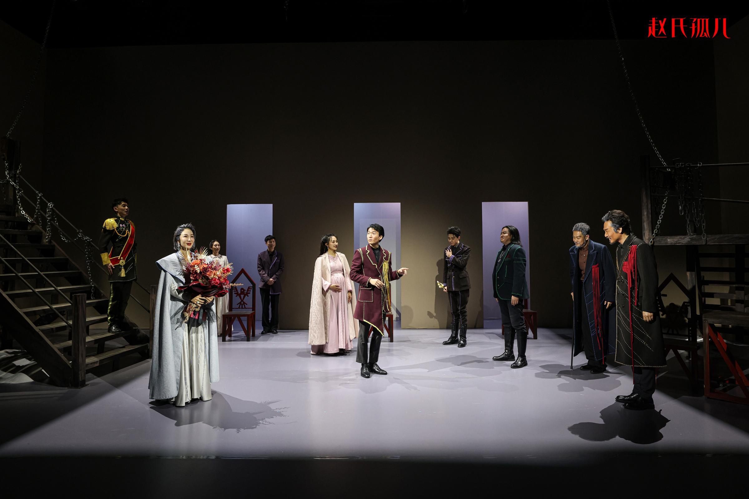 整部作品的叙事风格相当独特,剧中场景众多,幕与幕之间没有传统的起承转合,而是以片段的形式迅速切换,快速且激烈地展现了相当复杂的角色关系和剧情发展。金汉、周帅、李麟、石云鹏、徐菁遥等十余位青年演员在没有大量背景铺垫的情况下,在舞台上迅速立住了人物:金汉饰演的程婴忠诚隐忍,最终,却在谎言与丧子之痛的多年折磨下变得形容枯槁;周帅饰演的屠岸贾深沉阴狠,年老后孤独憔悴;石云鹏饰演的晋灵公看似多病懦弱,实际上深谙朝野驭人之道,他默许甚至操纵着臣子间的厮杀倾轧……一众青年演员在表演时爆发出的力量,的确有许多可圈可点之处。