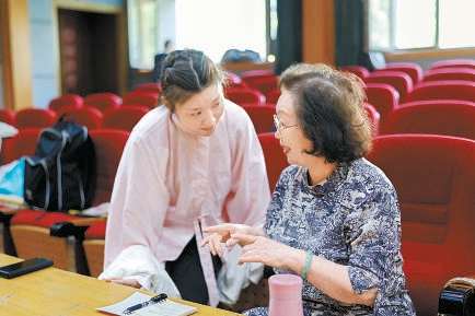 京剧表演艺术家阎桂祥(右)为陈张霞亲授《白蛇传》。苏岩摄