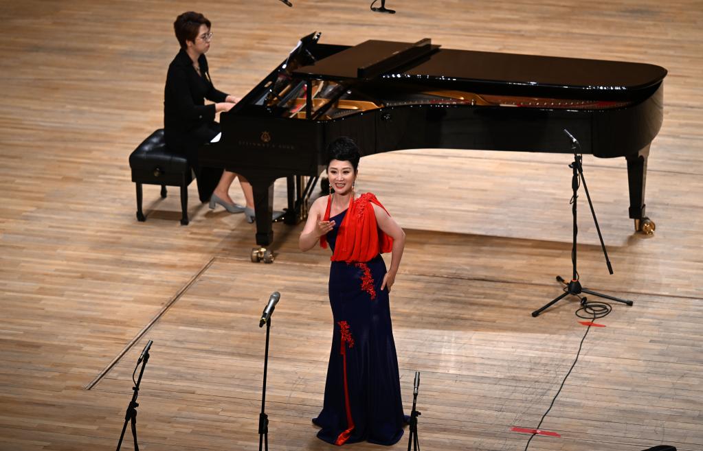 7月1日,天津歌舞剧院演员陈姝在演唱选自歌剧《玉鸟兵站》的曲目《我心永爱》。新华社记者 赵子硕 摄