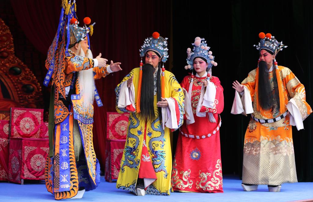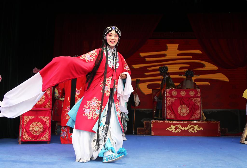 演员在甘肃省定西市体育公园演唱秦腔经典传统剧《打金枝》(9月19日摄)。新华社发(王克贤摄)
