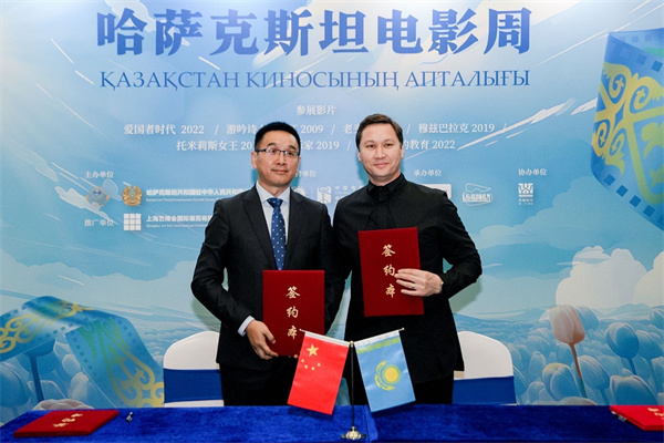 (左:壹家人文化集团总裁林进右:哈萨克斯坦国家电影集团总裁阿扎玛特·萨特巴勒德)