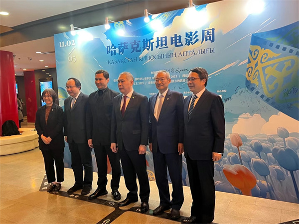 (从右向左:中国传媒大学校长张树庭,上海合作组织秘书长张明,哈萨克斯坦共和国驻华大使努雷舍夫,哈萨克斯坦国家电影集团总裁阿扎玛特·萨特巴勒德,国家电影局常务副局长毛羽,中国电影资料馆馆长孙向辉)