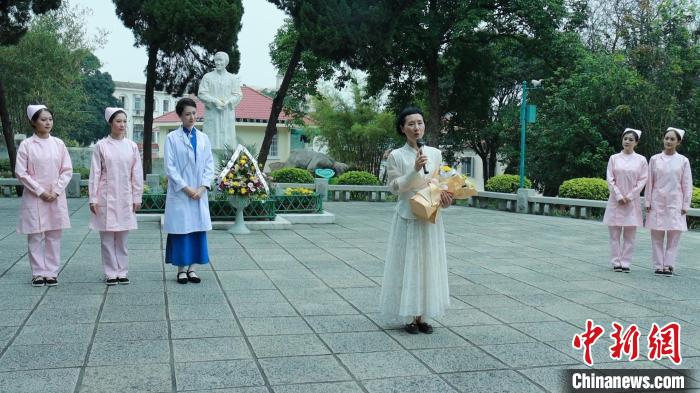 福建芳华越剧院演职员在林巧稚雕像前致敬致辞。福建芳华越剧院供图
