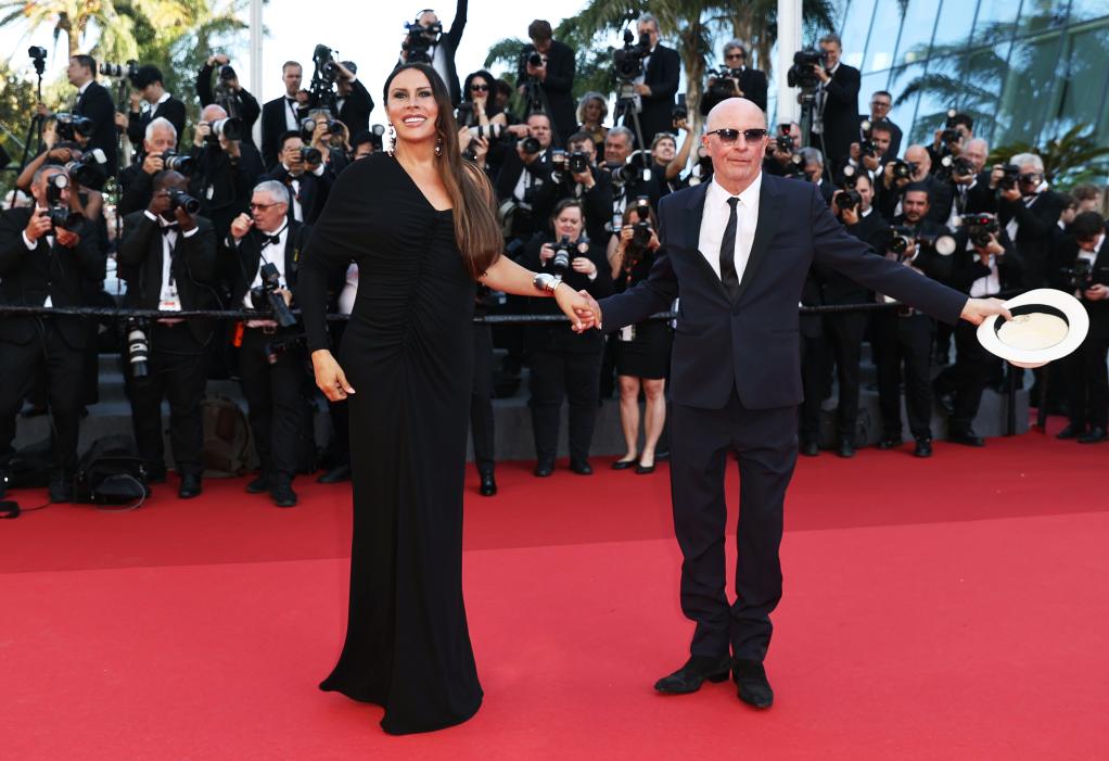 5月25日,在法国南部城市戛纳举行的第77届戛纳电影节上,演员卡拉·索菲亚·加斯孔(左)和法国导演雅克·奥迪亚尔抵达闭幕式红毯。新华社记者 高静 摄