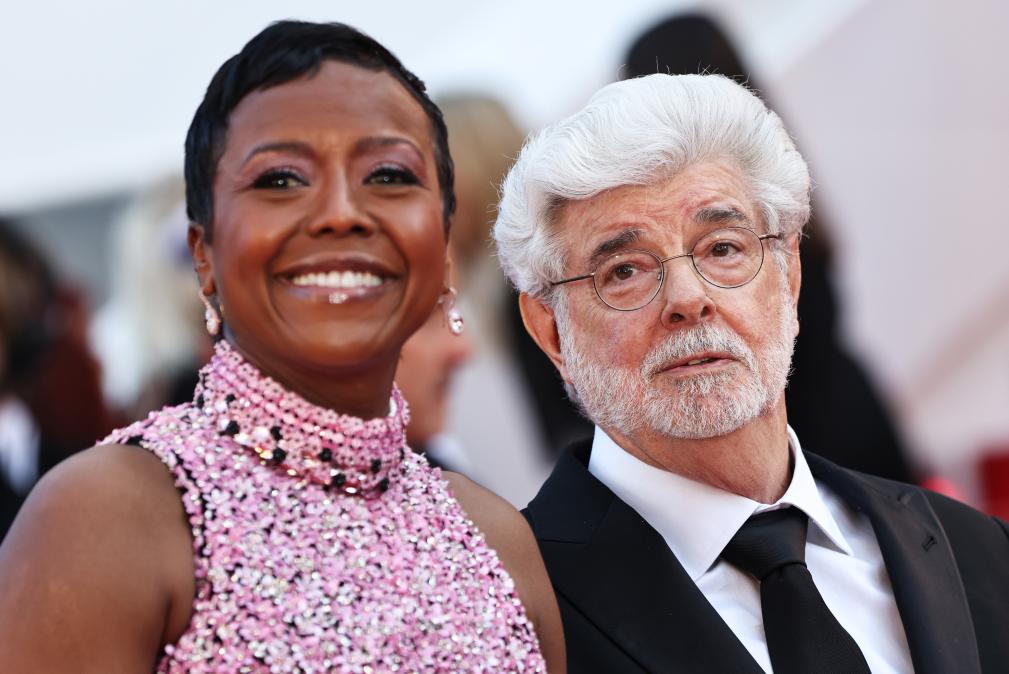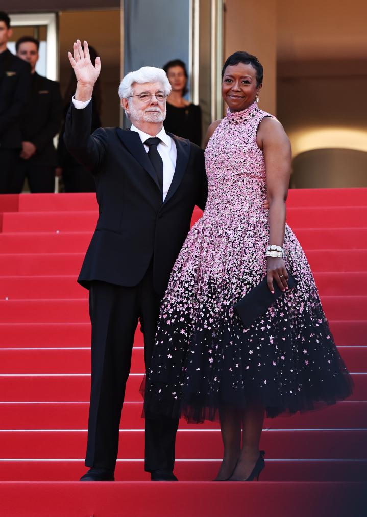 5月25日,在法国南部城市戛纳举行的第77届戛纳电影节上,美国导演、编剧、制片人乔治·卢卡斯(左)抵达闭幕式红毯。新华社记者 高静 摄