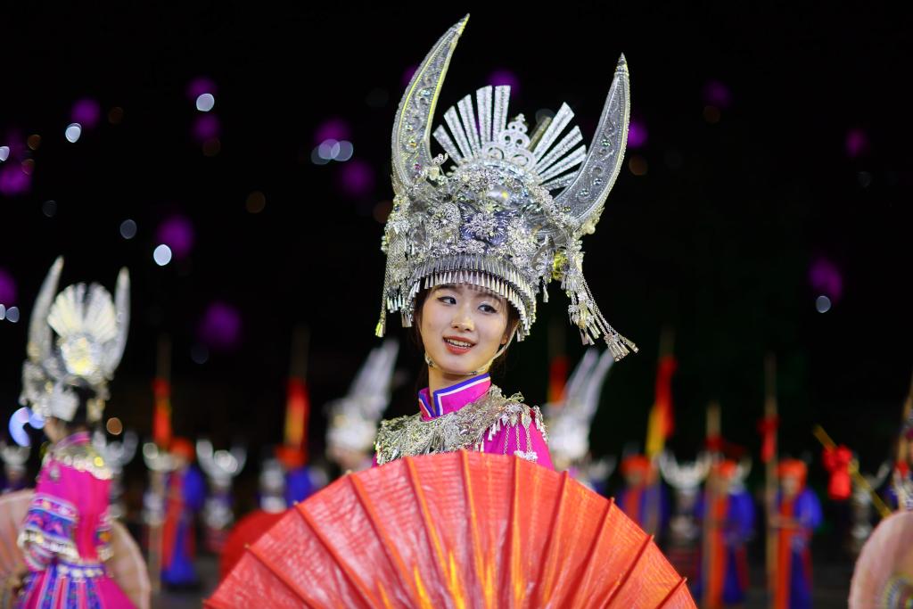 9月20日晚,演员在贵州省雷山县大塘镇表演苗族歌舞诗剧《仰欧桑》。新华社记者 杨文斌 摄