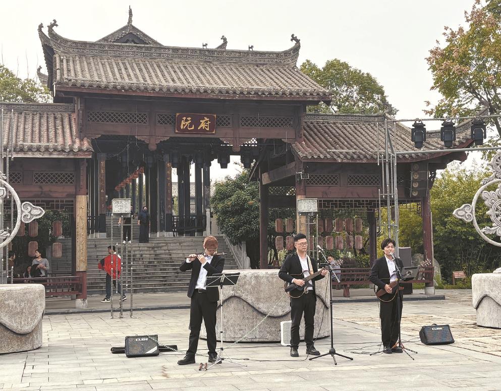 演艺新空间向外扩展,芜湖鸠兹小镇内,上海街艺音乐组合正在演出。文汇报记者 孙彦扬摄