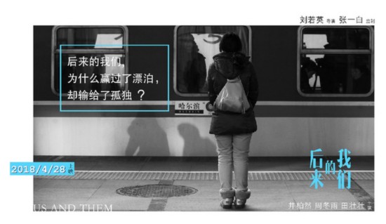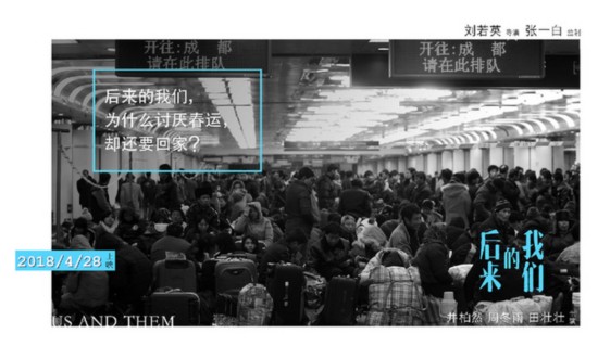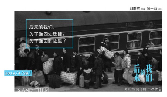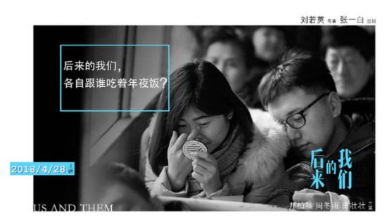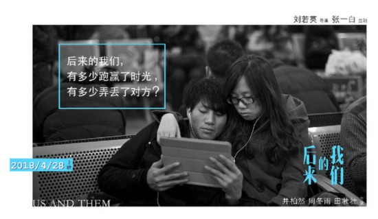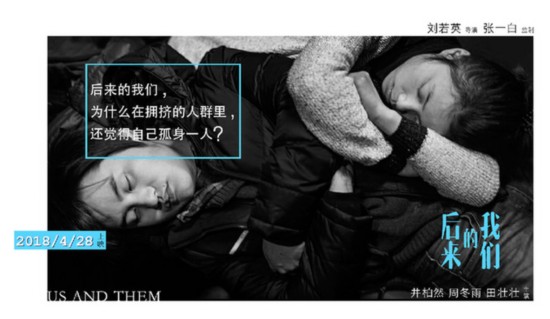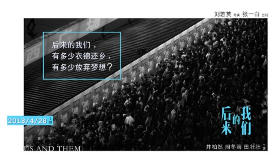 刘若英导演电影处女作《后来的我们》昨天(11日)发布第一波海报与预告,并宣布定档4月28日。该片由张一白监制,井柏然、周冬雨领衔主演,田壮壮主演。值此春运回家高峰期发布的系列海报,用质问的方式带出人生与春运的现实主题:〝为什么只有过年,才会想到回家?〞、“为什么讨厌春运,却还要回家?”、“为什么在拥挤的人群里,还觉得自己孤身一人?”等,直戳观众内心,引发热议。刘若英导演也希望透过春运的提问,让这个爱情故事更贴近现实生活与人生感动。