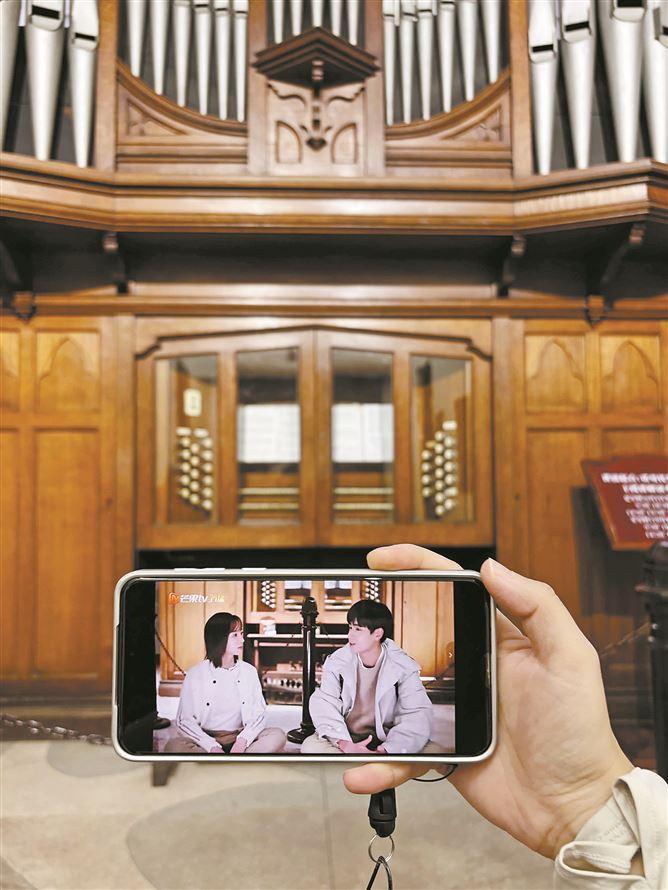 来鼓浪屿打卡的游客将剧照和现场对比,拍照留念。
