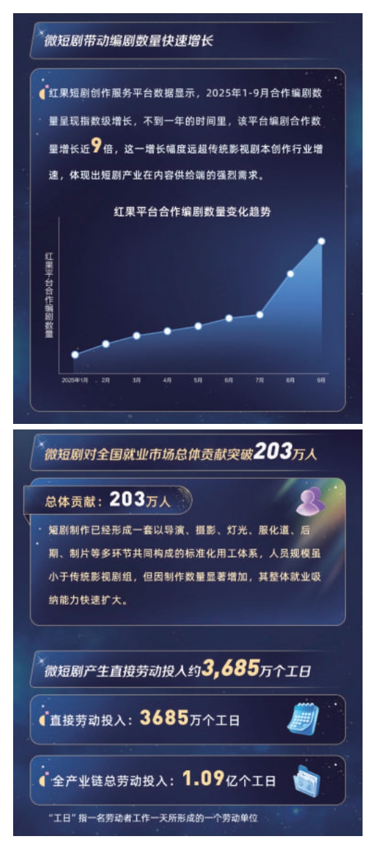 这不仅大幅提升了人力资源的利用效率,也为从业人员带来了长期且稳定的工作预期,吸引了大量人才涌入。以编剧为例,红果短剧创作服务平台数据显示,2025年1-9月合作编剧数量呈现指数级增长,不到一年的时间里,平台编剧合作数量增长近9倍,远超传统影视剧本创作行业增速。
