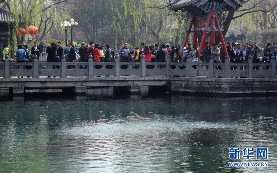 3月22日,济南趵突泉水位跌破红色警戒线,喷涌乏力。当日,济南趵突泉实时水位降至27.59米,跌破27.60米的红色警戒线,面临停喷危险。趵突泉水位走低的主要原因是春季干旱及春灌的影响。新华社记者 徐速绘 摄