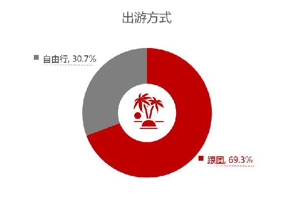 出游方式方面,跟团游为主要的出游方式,占比60.8%,自由行占比33.2%,目的地参团占比6%。