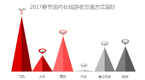 出游交通工具选择方面,81.4%的国内长线游者选择了飞机(选择了以飞机为交通方式的旅游团或自由行套餐),其次是高铁,占比6.4%。