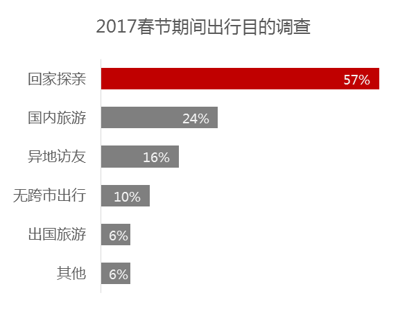 《报告》关于2017年春节跨市出行(长途出行)意愿的在线问卷调查数据显示,“回家探亲”是受访者春节期间长途出行的第一大动机,“国内旅游”则是第二大出行动机。总体而言,受访者能够明确给出的春节出行动机中,除了“回家探亲”,就是旅游(国内游和出境游)。这表明,居民2017年春节期间的旅游消费意愿强烈,旅游过年已经成为较为主流的过年方式。