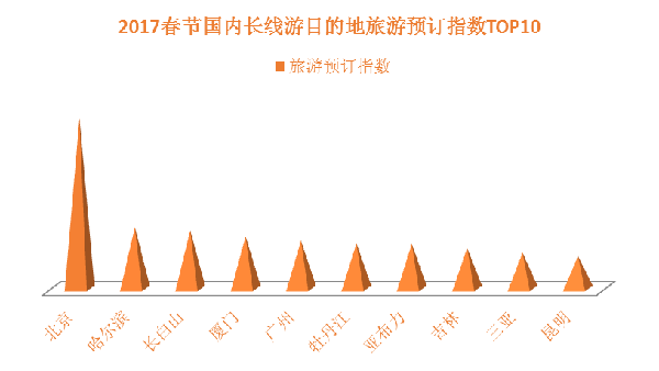 一般情况下,春节期间的国内长线游(行程3日以上,居住地300公里外)需求的出游人数在总体长线游需求中占比最大。《报告》数据显示,北京、哈尔滨、长白山、厦门、广州、牡丹江、亚布力、吉林、三亚、昆明是2017年春节期间最热门的十个目的地(以《报告》发布时的线路预订数据统计),其中哈尔滨、长白山、牡丹江、亚布力、吉林五个目的地全部来自东北地区,春节期间冰雪游线路的火爆是它们上榜的共同原因,厦门、三亚、昆明等则为黄金周国内游传统热门目的地。另外,不同城市居民春节国内长线游的目的地偏好略有差异,例如,北京最受欢迎的春节国内游目的地主要有广州、珠海、哈尔滨、长白山,上海最受欢迎的春节国内游目的地主要有长白山、北海、三亚、北京等,广州最受欢迎的春节国内游目的地主要有贵阳、张家界等。