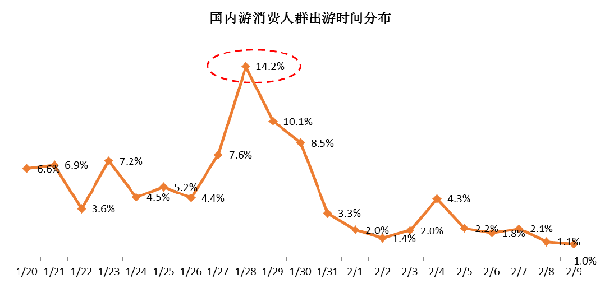 出游时间方面,春节国内长线游者选择节前错峰游的占比38.3%,春节黄金周期间出游的占比47.2%,1月28日(正月初一)达到客流峰值,选择节后错峰出游的仅占比14.5%。