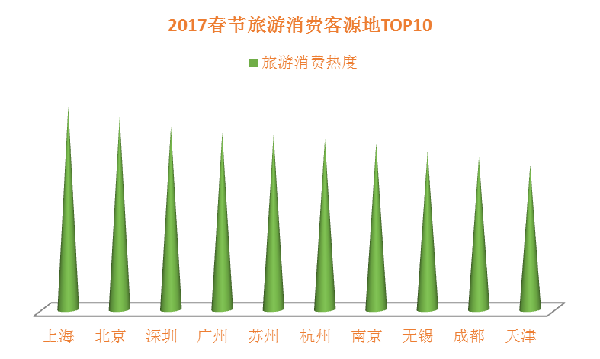 整体的客源分布方面,上海、北京、深圳、广州、苏州、杭州、南京、无锡、成都、天津十个城市的春节出游人数最多(截止《报告》发布时的预订数据)。