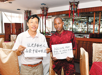 2月8日,在肯尼亚首都内罗毕一家中国餐厅,餐厅经营者祁溥莹(左)和同事帕特里克·奥根切·奥托托展示各自的新年心愿。
