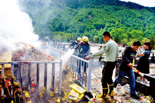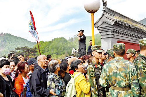 19日上午,中心区旅游人数达到峰值,五爷庙前的广场是安保压力最大的区域,按照活动《方案》建立了两道隔离带,公安民警、武警、消防、保安紧密协作,分兵把守,有序放行。在五爷庙前的焚香区,武警战士组成人墙迎接一浪高过一浪的人潮冲击,确保了万千游客的绝对安全,豆大的汗珠顺着他们的脸颊不断流淌。