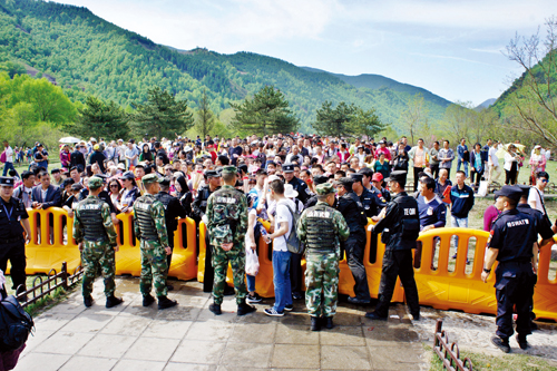 5月18日深夜,随着三个入山口人流的骤增,原定22时30分上岗的民警提前到20时全部到位。23时40分,记者来到南线游客中心,只见潮水般的人群涌向售票大厅,不少公安民警在安监门口严密把守,有序放行,站在台阶上的民警手举超大口径的大喇叭向嘈杂拥挤的人海不断地呼喊:“不要拥挤,有序排队!”在游客中心东边的交通要道上,全副武装的交通民警正在紧张地疏导川流不息的车辆。19日1时灯光下,记者看到担任此次安保总指挥的市公安局局长杨梅喜在寒风中与民警一道指挥交通。