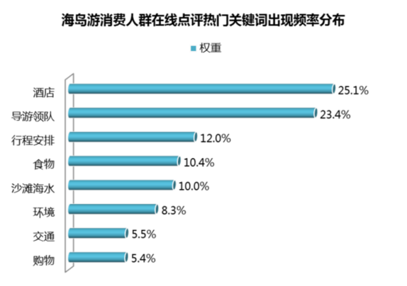 《报告》基于同程旅游海岛游用户在线点评数据的分析显示,“住”是海岛游消费人群最为关注的一个消费元素,其次是人员服务(尤其是导游领队),与游客全程接触的导游领队的服务态度、专业度等也非常受关注,甚至成为影响游客最终评价的关键因素。相比之下,购物的关注度相对较低,这与普通的旅游线路存在较大差别。此外,沙滩、海水等与海岛相关的风景元素受关注程度较高,不少游客在点评中用较大篇幅描述沙滩、海水等风景元素。